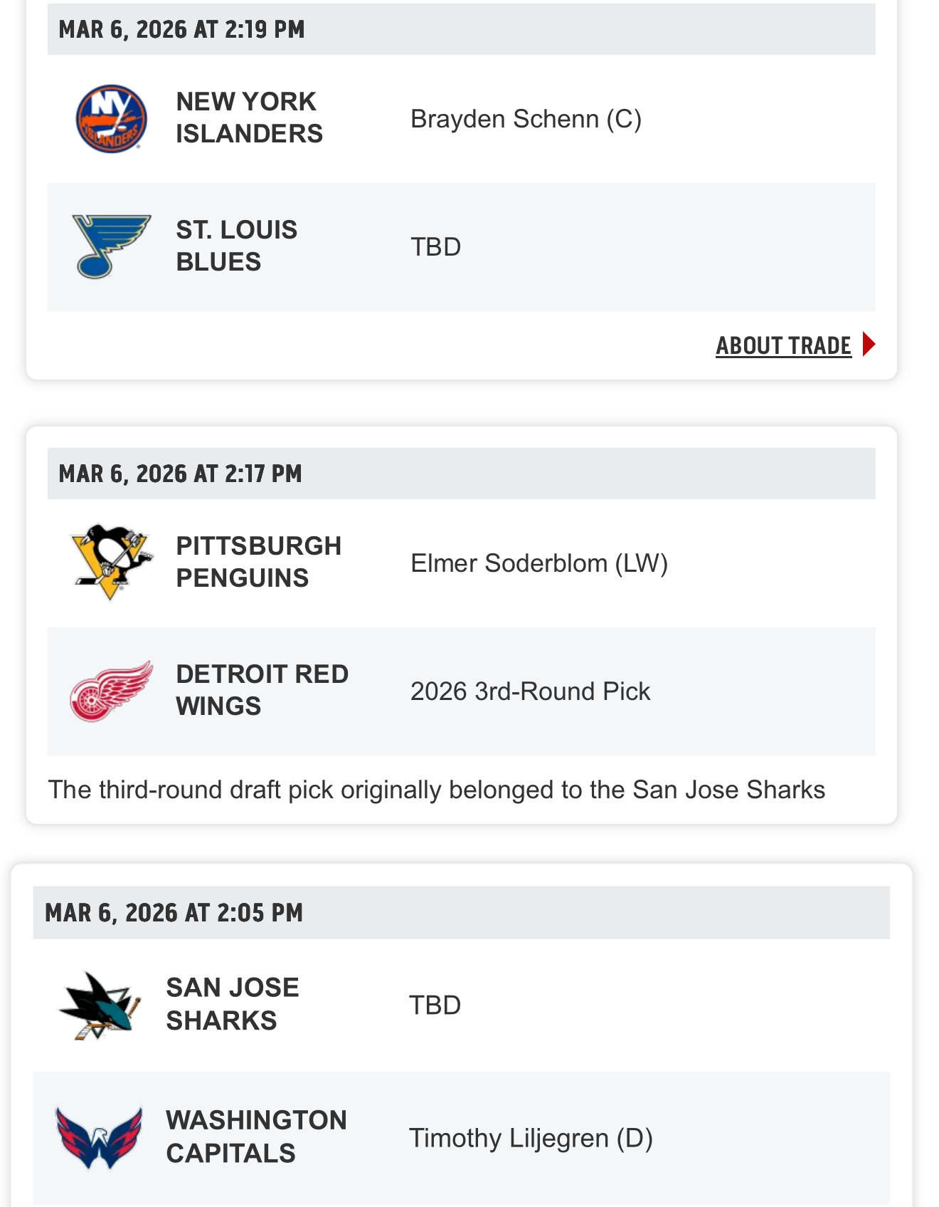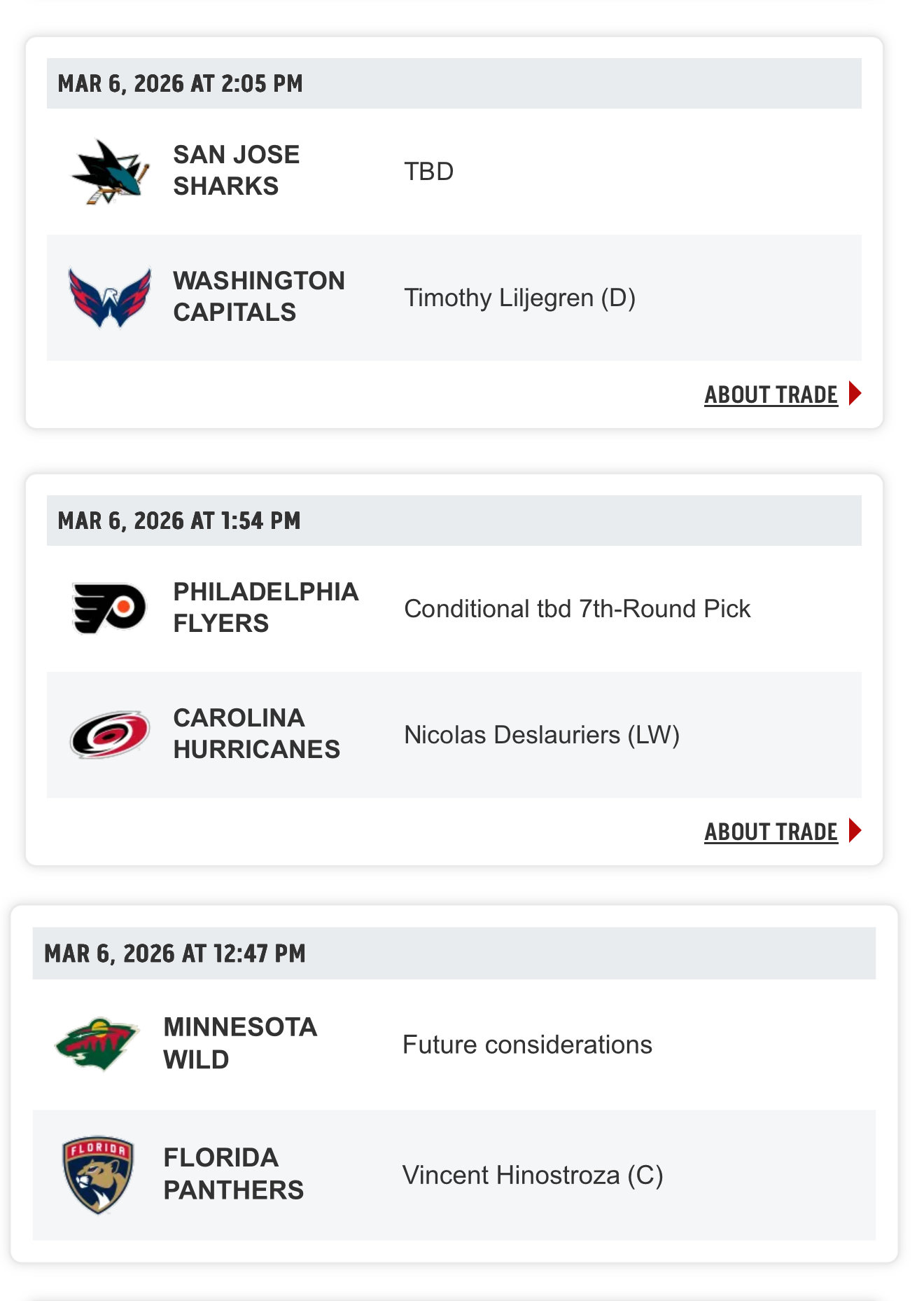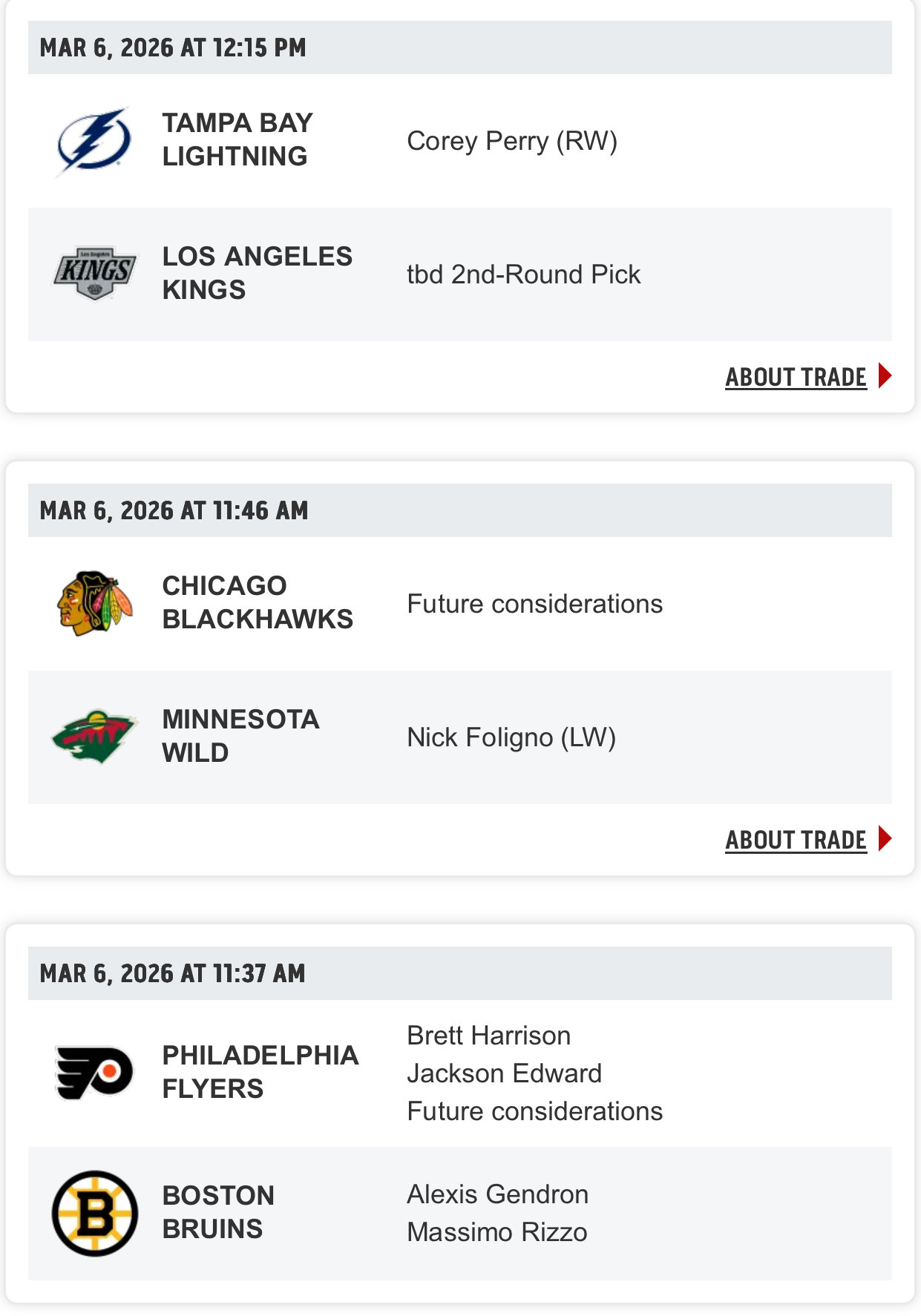 Trade #1: 10:26 AM EST First move of the day comes from the Wild who bring in right winger Bobby Brink for defenseman David Jiricek. To note: there were a few moves made late last night that won’t be included towards today’s count. 1) Garland to Columbus for 2nd & 3rd (2028 & 2026) to Vancouver (12:20 AM) *2) Carrick to Buffalo for 2nd & 3rd (2026 & 2026) to Rangers (12:53 AM) *3) Luke Schenn & Logan Stanley to Buffalo for Bryson, Rosen, 2nd & 4th (2027 & 2026) to Winnipeg (12:55 AM) 4) Carlson to Anaheim for conditional 1st & 3rd (2026 & 2027) to Washington (1:22 AM) * #2 & #3 were part of a three team trade