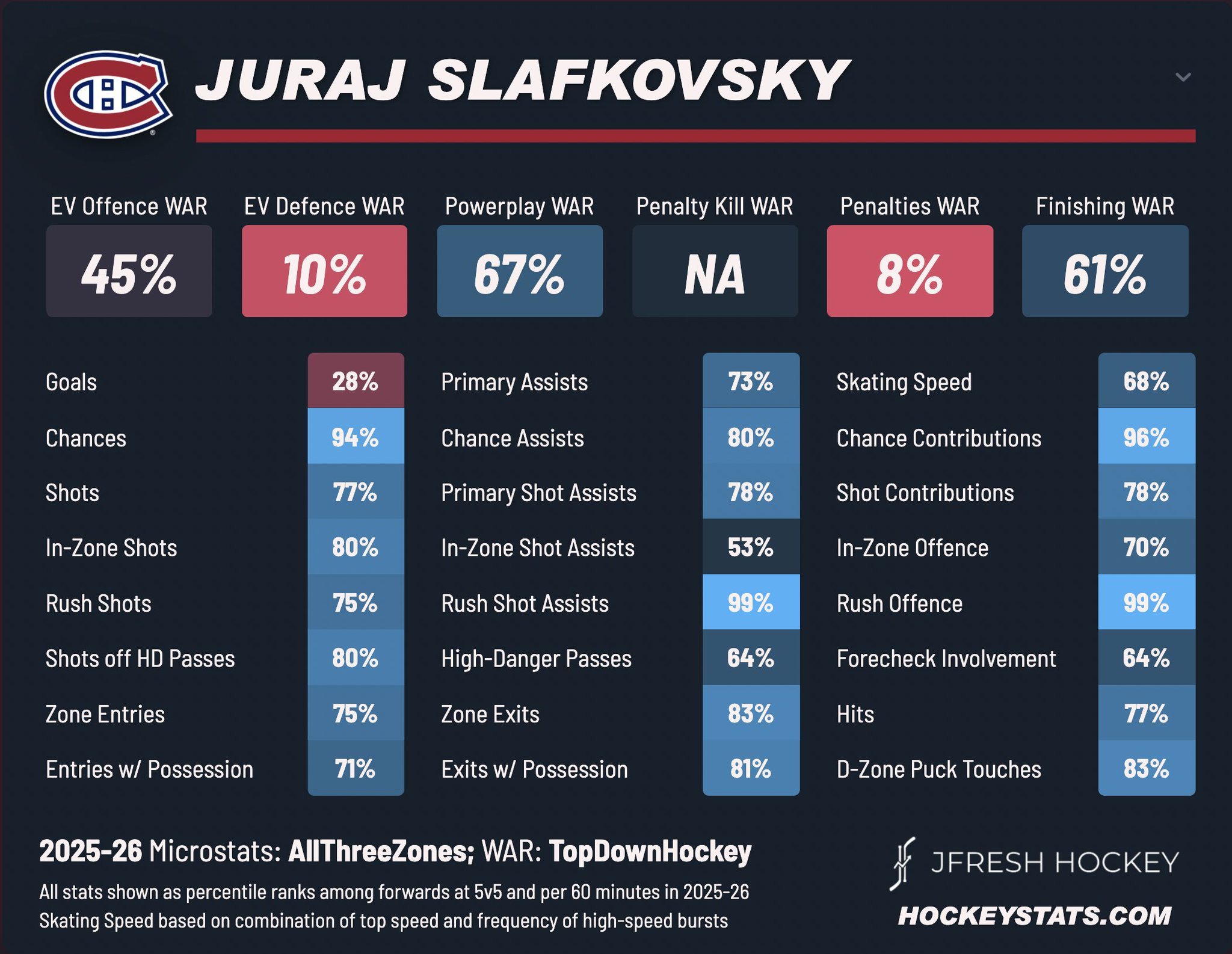 If you look at all of the play driving offensive stats Slafkovsky is rated very high in all 18ish categories. Kapanen is rated very low in all 18 of those metrics.