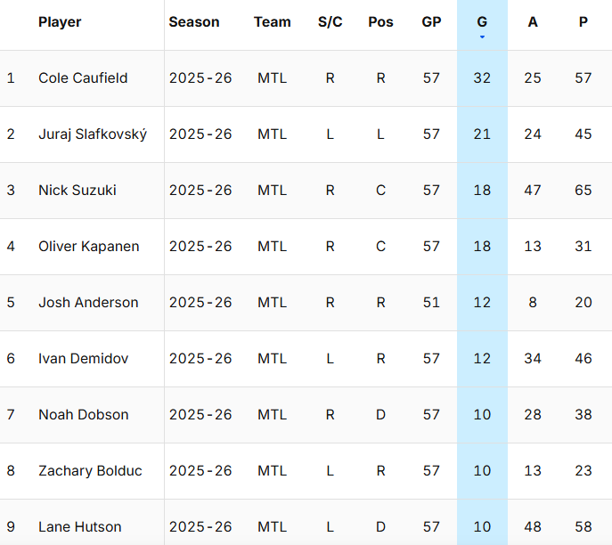 FWIW; Habs will have 4 20+ goal scorers this year, 5 if Demidov has big finish to season. Had 4 last season and 2 30g scorers. How many will Slaf get in last 25 games?