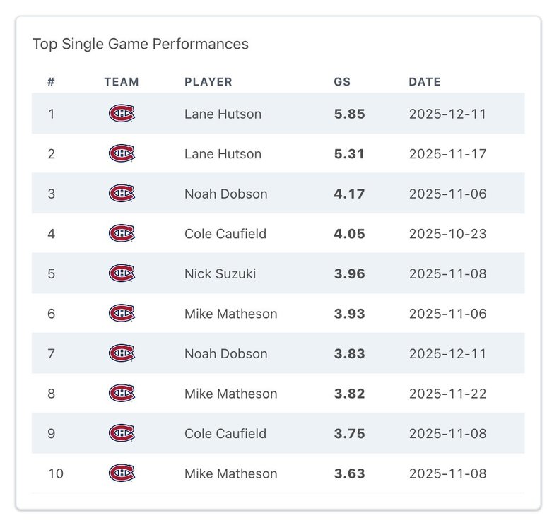 Great win against Pittsburg and the changes to the lineup were welcome. Engstrom looks to me like he is an improvement over both Struble and Xhekaj. I hope St. Louis plays the same roster, perhaps subbing Xhekaj in for Struble We all know that Hutson is a beast but his numbers from one game paired with Dobson were the best of any player this season. Is Struble weighing Hutson down? Dobson sure looked good with Hutson. Top individual stat scores of the season: Another player that is proving his worth is Slafkovsky. Put him on the second line and that line greatly improves. Remove him from the top line and their production drops dramatically. I continue to say that Slafkovsky is way under appreciated I personally would like to see Fowler play again. He was outstanding and we need to see if that was a fluke. Not to mention that he should be rewarded for his play. Go Habs Go