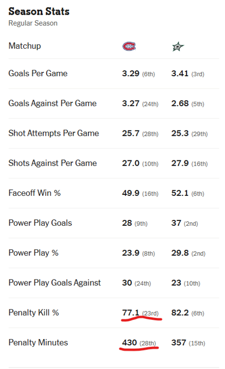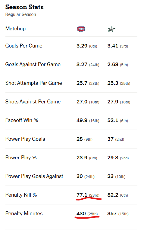 Habs 22-19 vs Stars 25-16 Tough match-up, but 4 losses in a row for Stars gives some hope. Habs penalties and PK not helping Habs record.