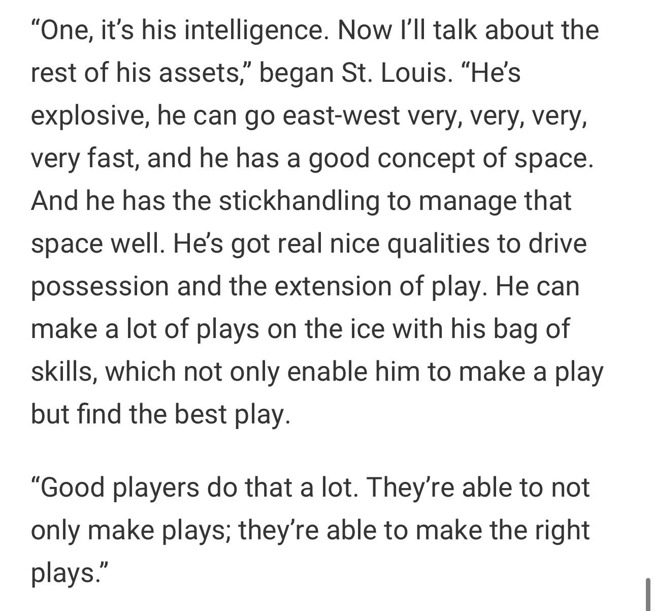 Prime Minister Koivu Posted October 13, 2024 Posted October 13, 2024 1 hour ago, DON said: Nice write up by Basu on lil Lane; "...Hutson spoke to only 16 teams at the combine that year, meaning half the league couldn’t even have been bothered to talk to him ahead of the NHL Draft, let alone entertain the thought of drafting him." "— and coach Martin St. Louis was asked roughly 80 questions about Hutson after the game because, as Cole Caufield said, “He deserves all that hype.”" "An NHL rookie is expected to adjust to the NHL, adjust to his teammates. It is exceedingly rare to hear an NHL coach, one that is in the Hockey Hall of Fame as a player, state that the NHL players the rookie is playing with need to adjust to the rookie." Lane Hutson predicted Canadiens wouldn’t care about his size. He’s proved himself right - The Athletic (nytimes.com) Quotes from St. Louis on Hutson that was posted by Engels: Quote