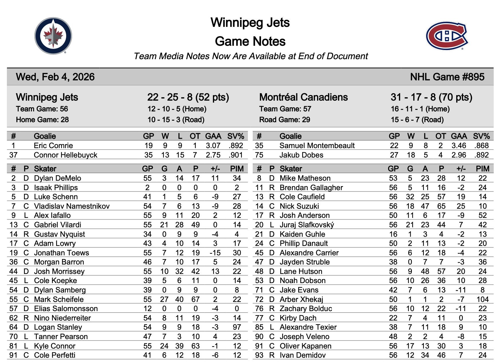 DON Posted Wednesday at 02:47 PM Author Posted Wednesday at 02:47 PM Canadiens @ Jets: Game preview and how to watch Whatever happened to the goalies who made last season’s rosters for the 4 Nations Face-Off has stricken Connor Hellebuyck as well. His .901 save percentage has him well off his usual level, no lower than a .920 mark in the past three seasons. That means five goals against every 50 shots this season instead of his typical four, so about one extra goal every two games. The reigning Hart Trophy-winner and back-to-back recipient of the Vezina Trophy won’t be in the running for any individual awards this season. Winnipeg is currently the only team with an average age over 30, and maybe that’s starting to catch up with them. Quote